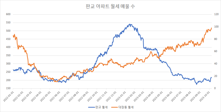 대장동 아파트 월세 매물 수는 지속 증가하고 있습니다.