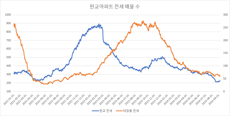 대장동아파트 전세 매물 수는 2주 연속 감소했습니다.