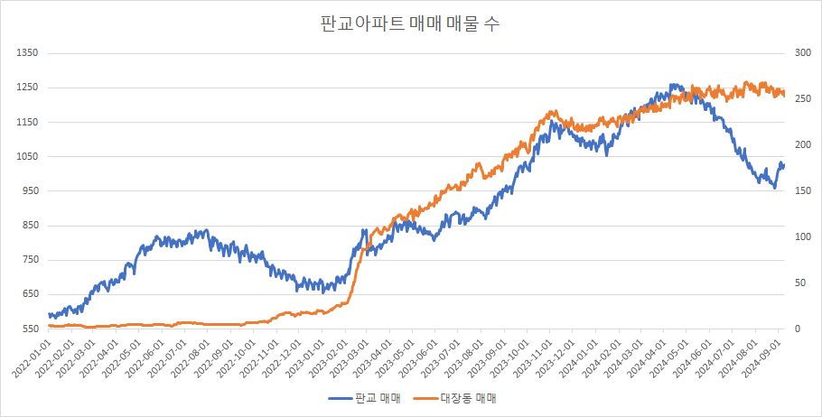 대장동아파트 매매 매물 수는 고점 부근에서 횡보하고 있는데, 이번주에는 다시 감소했습니다.