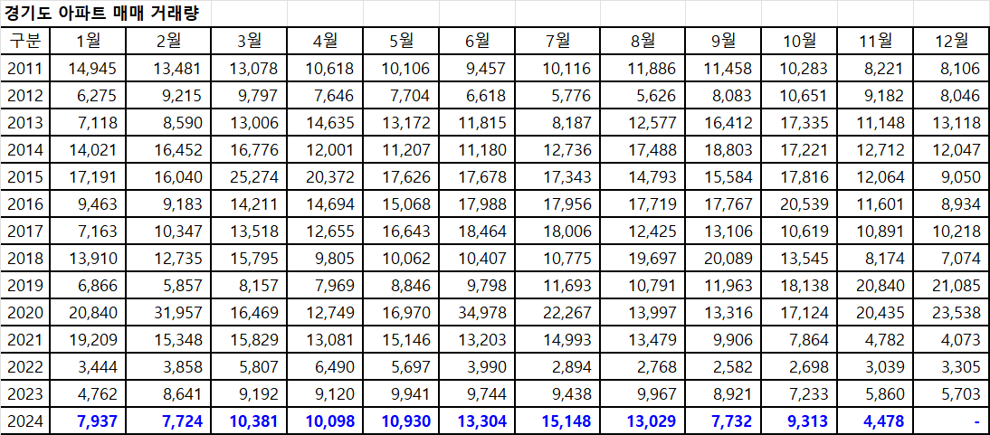 아래 표는 경기도아파트 매매 거래량입니다.