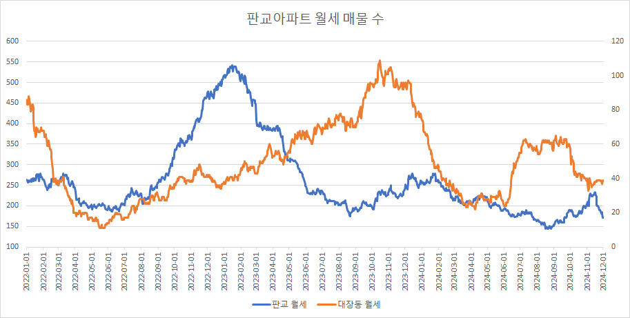 대장동아파트 월세 매물 수는 2주 연속 보합을 보이고 있습니다.