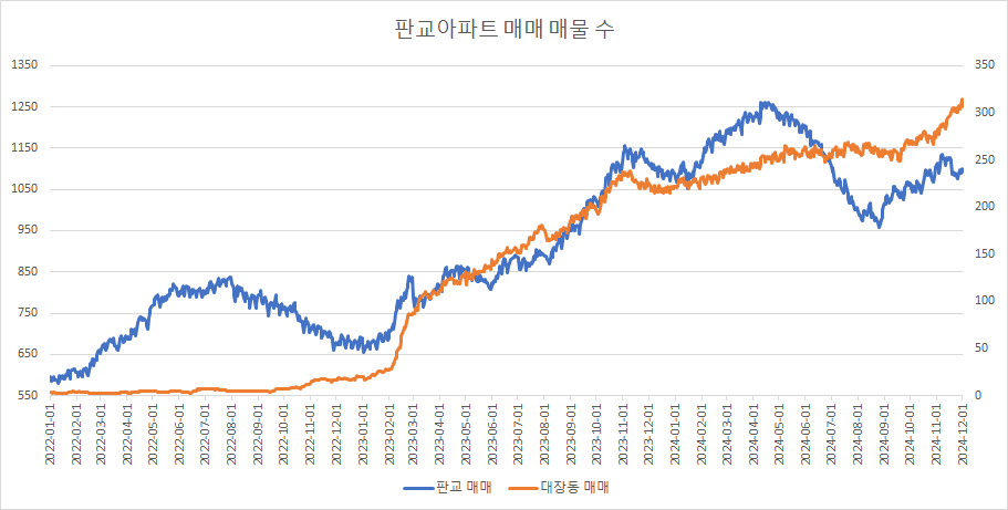 대장동아파트 매매 매물 수는 전고점을 넘어서면서 본격 상승 추세를 보이고 있는데, 이번주에는 큰 폭으로 증가했습니다.