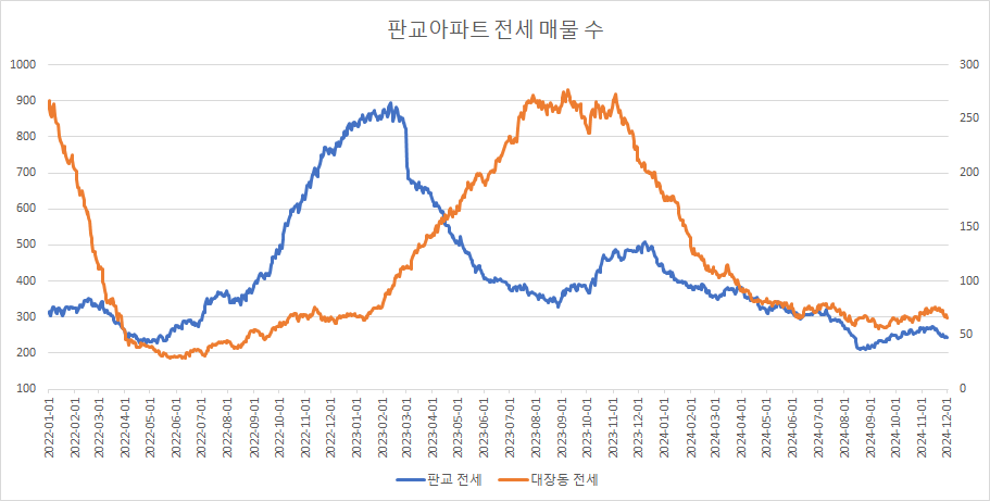 대장동아파트 전세 매물 수는 바닥에서 증가 추세를 만들고 있었는데, 이번주에는 큰 폭으로 감소했습니다.