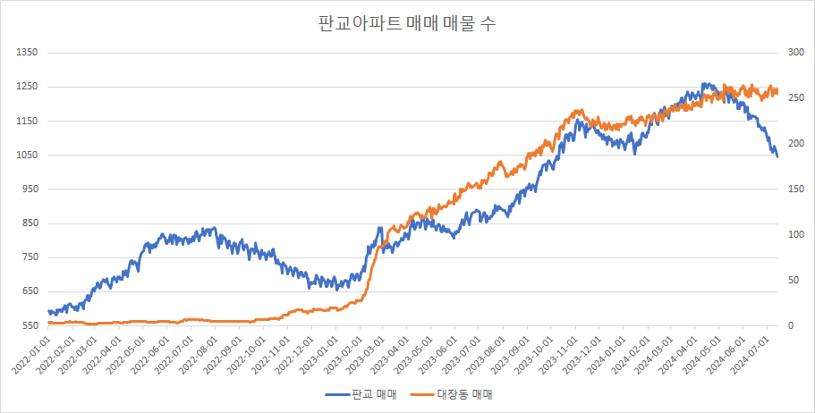 대장동아파트 매매 매물 수는 주 단위고 고점에서 증가와 감소를 반복하고 있는데, 이번주에는 감소했습니다.