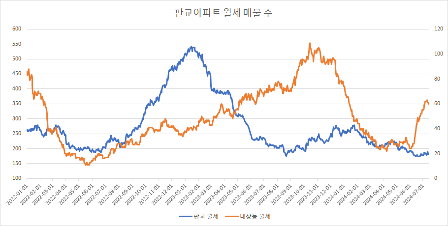 판교아파트 월세 매물 수는 바닥에서 최근 2주 연속 증가했으나, 이번주에는 다시 감소했습니다.