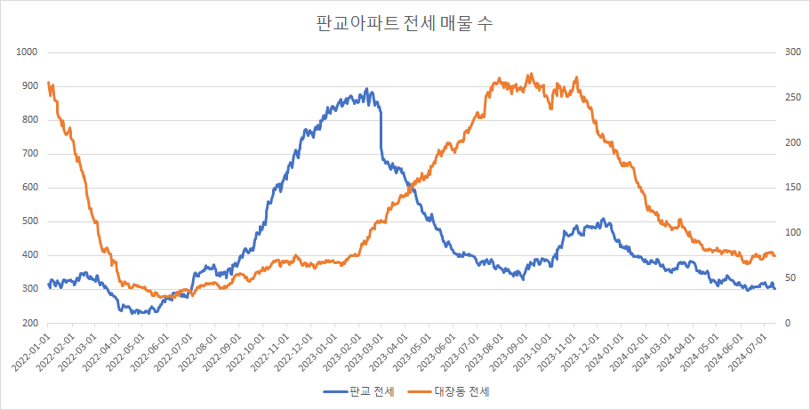 판교아파트 전세 매물 수는 최근 소폭 증가하고 있었으나, 다시 2주 연속 감소하고 있습니다.