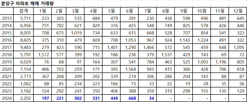 아래 표는 분당구아파트 매매 거래량입니다.