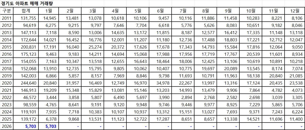 1월 경기도아파트 매매 거래량은 현재 5,703건입니다. 이 데이터로 1월 경기도아파트 최종 매매 거래량을 예측해 보면, 약 14,023건이 됩니다.