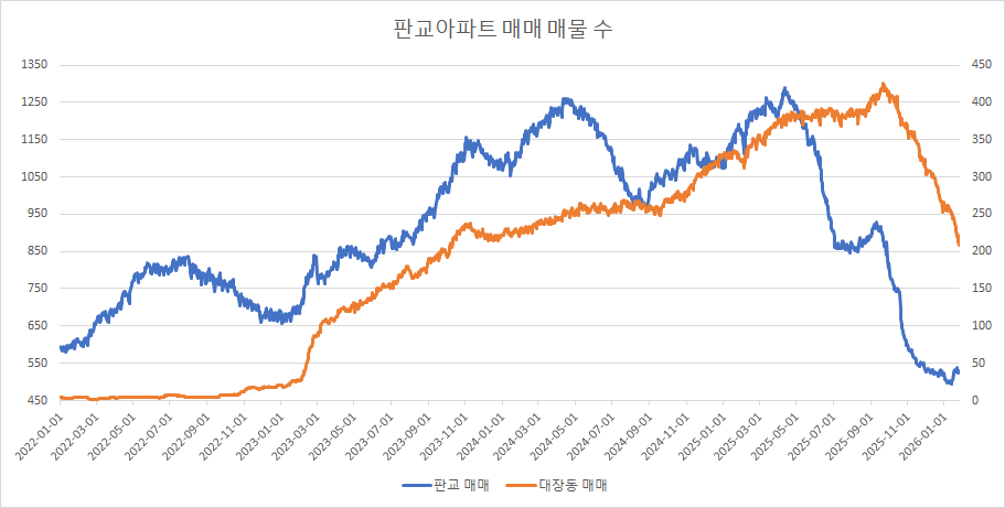대장동아파트 매매 매물 수는 2주 연속 큰 폭으로 감소하고 있습니다.