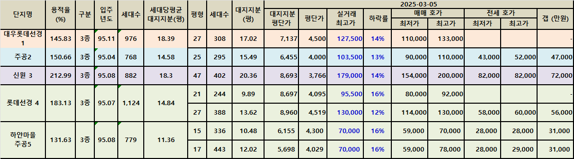 아래 표를 보면 이러한 급매물은 대부분이 10% 초반대의 하락율을 보이고 있는데, 16%의 하락율을 보이고 있는 롯데선경아파트 21평과 하얀마을 주공5단지아파트 15평, 17평 모두 1층 매물입니다.