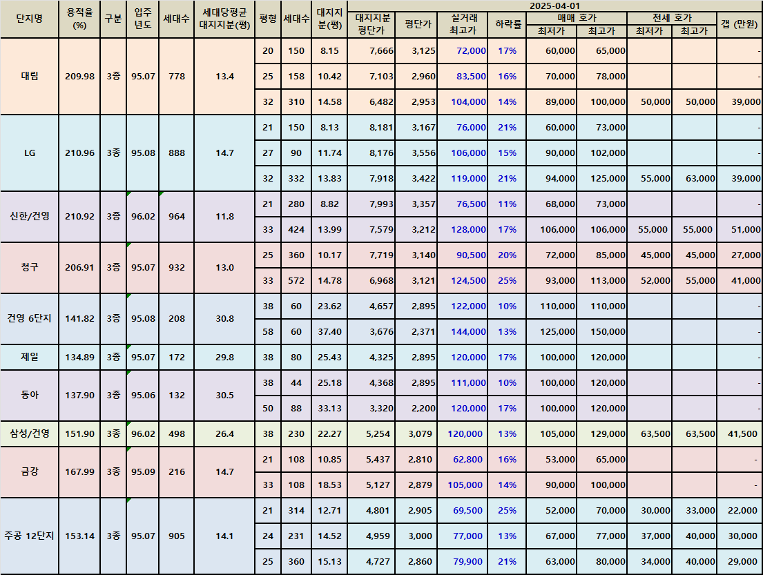 구미동 무지개마을아파트 매매가와 전세가를 전수 조사 후 한 달 전 데이터와 비교했습니다.