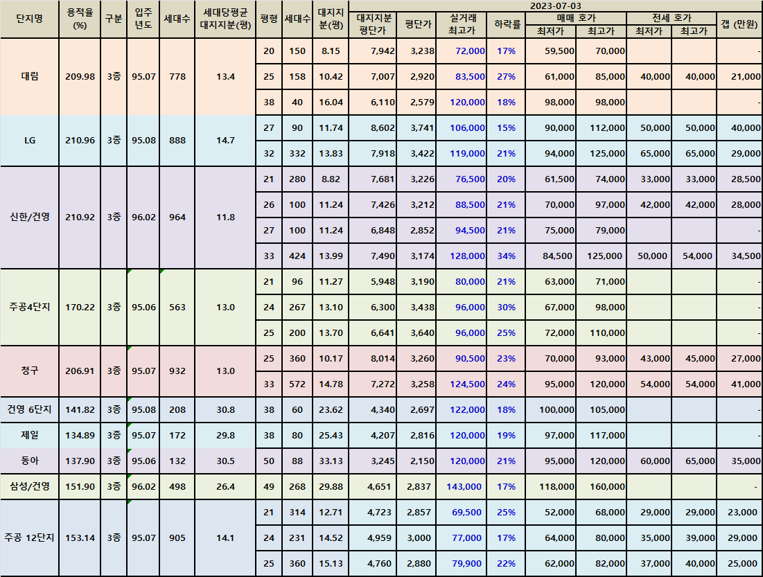 이제까지는 18% 이상 하락한 매물을 정리했으나 대상이 너무 줄어 들어서 이번달부터는 15% 이상 하락한 매물을 대상으로 정리하겠습니다.