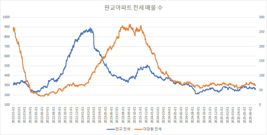 대장동아파트 전세 매물 수는 최근 2주 연속 보합을 보이고 있었으나, 이번 주에는 감소했습니다.
