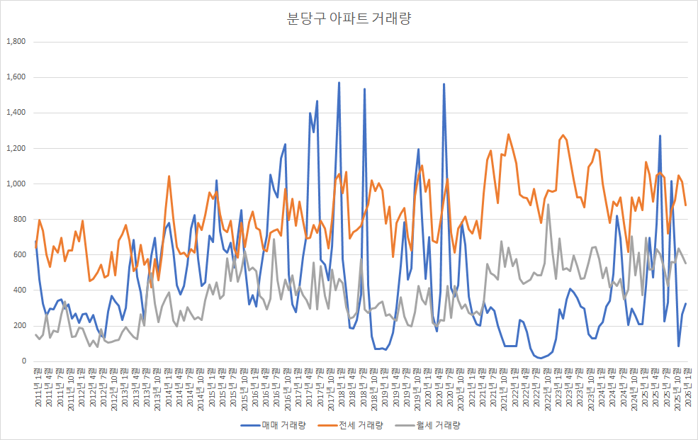 1월 분당구아파트 매매 거래량은 현재 325건입니다. 이 데이터로 1월 분당구아파트 최종 매매 거래량을 예측해 보면, 약 326건이 됩니다. 분당구아파트 시장 또한 작년 11월과 12월의 거래량 침체에서 벗어나는 모습을 보여주고 있습니다.