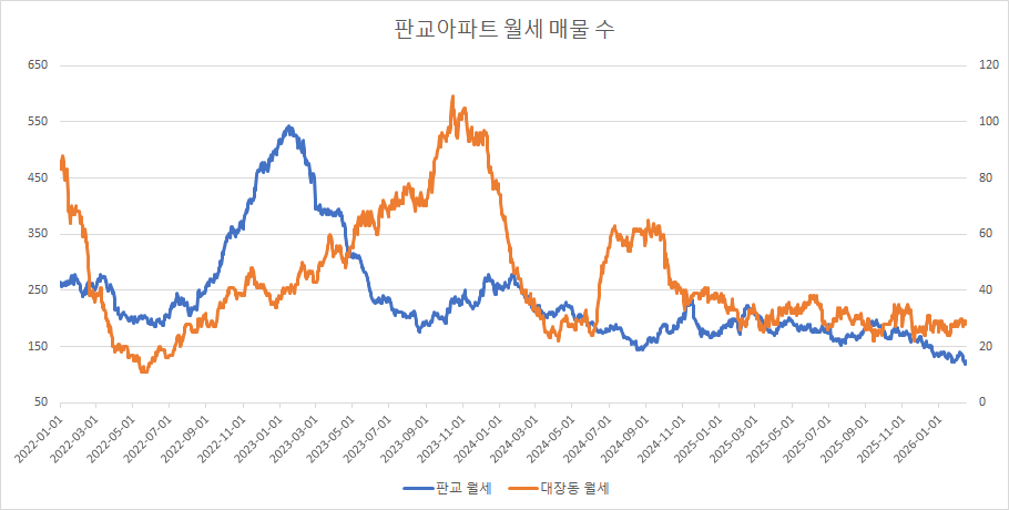 판교아파트 월세 매물 수는 최근 2주 연속 소폭 증가했으나, 이번 주에는 큰 폭으로 감소했습니다.