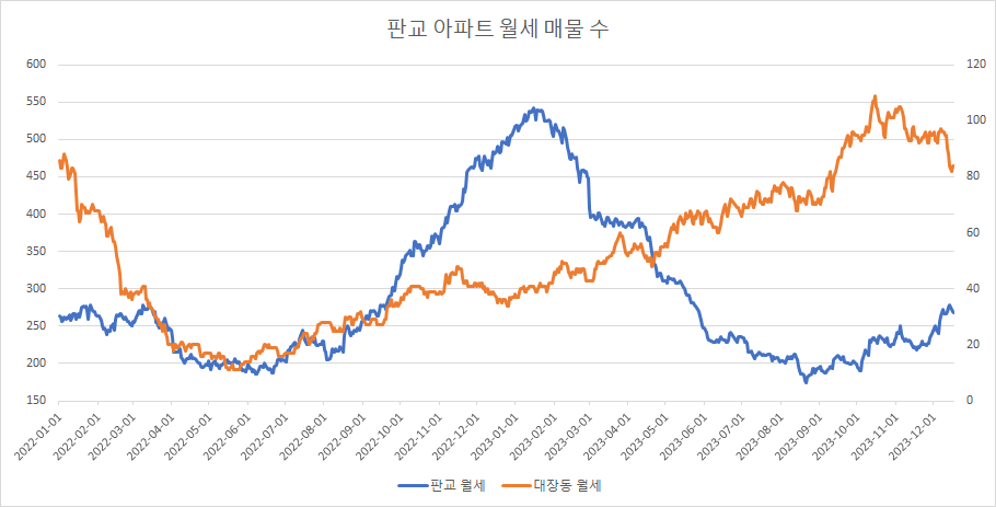 판교아파트 월세 매물 수는 다시 증가로 돌아서고 있습니다.