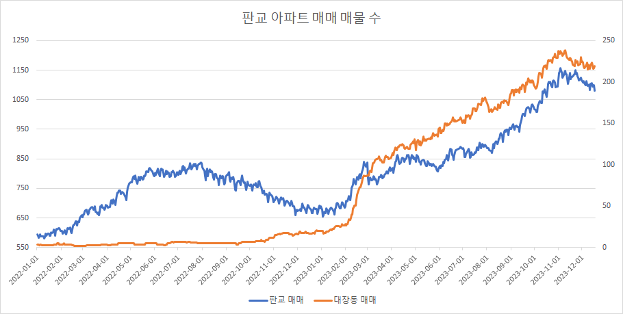 대장동 아파트 매매 매물 수는 고점에서 3주 연속 감소 후에 최근 2주간 보합을 보이고 있습니다.