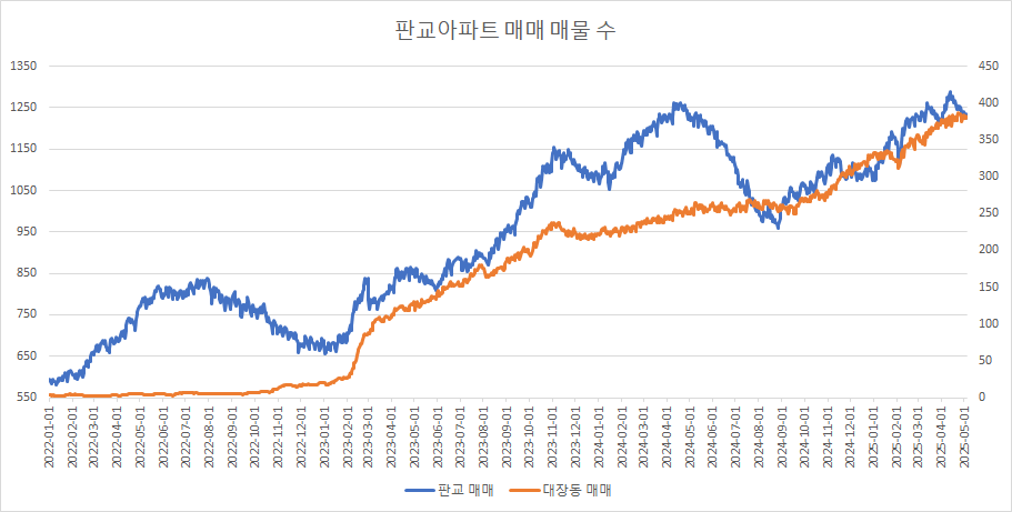 대장동아파트 매매 매물 수는 지난주에는 보합이었으나, 이번 주에는 다시 증가했습니다.