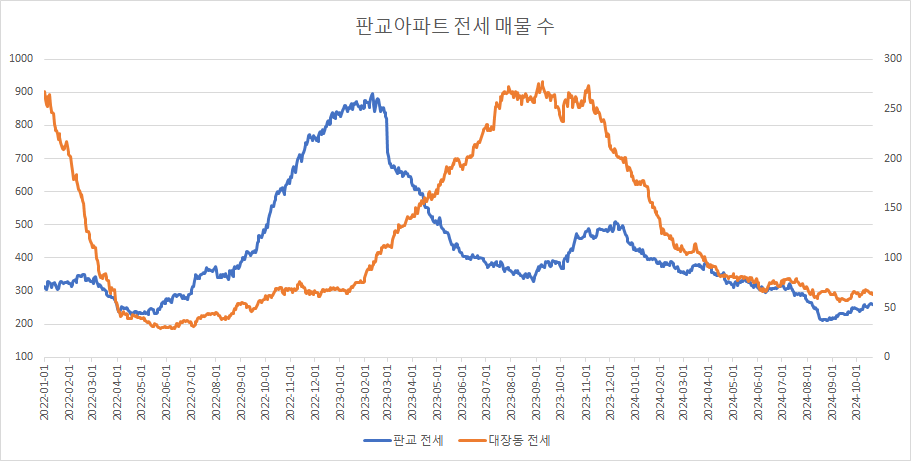 판교아파트 전세 매물 수는 2주 연속 증가하고 있습니다.