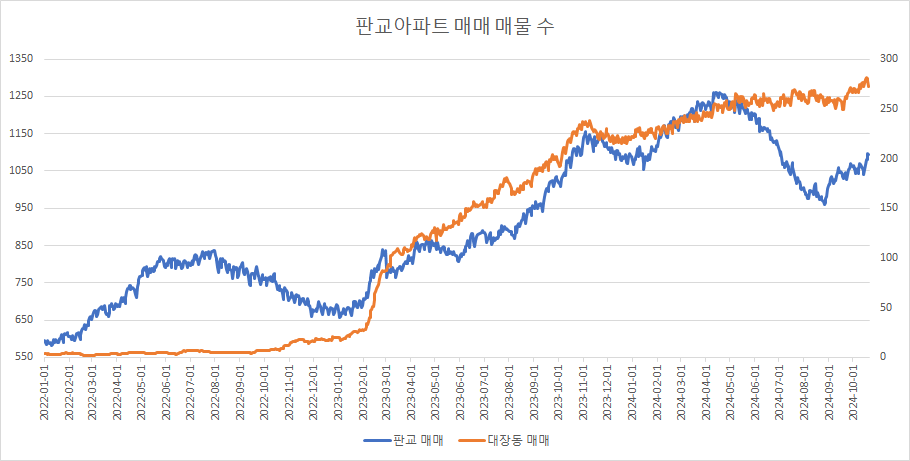 대장동아파트 매매 매물 수는 최근 5주 연속 증가 중이었으나, 이번주에는 소폭 감소로 돌아 섰습니다.