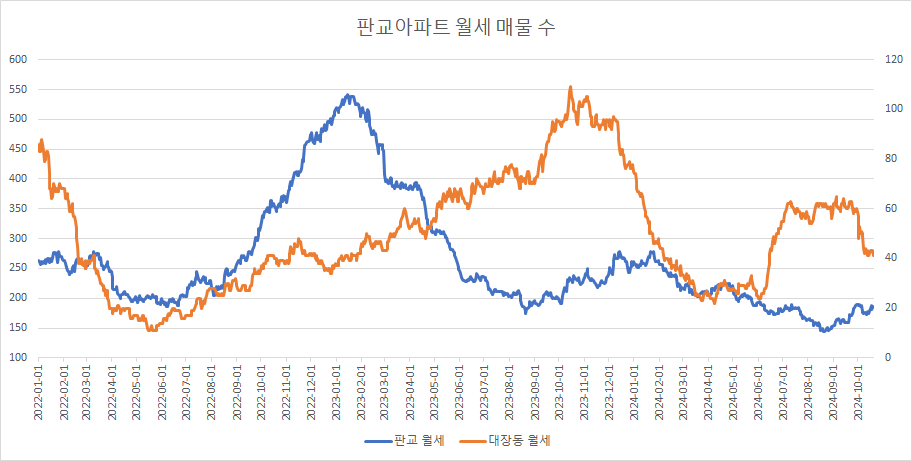 대장동아파트 월세 매물 수는 최근 3주 연속 감소 중이었으나, 이번주에는 보합을 보이고 있습니다.