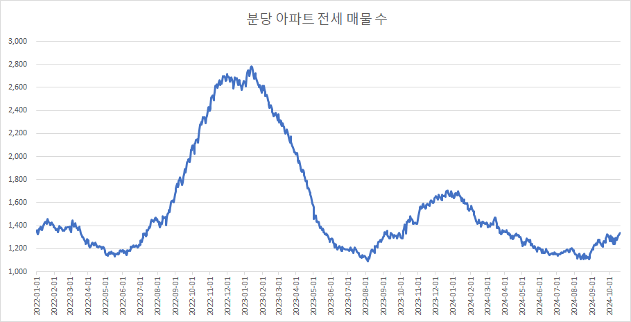 아래 그래프를 보면, 분당아파트 전세 매물 수가 추세작으로 증가하려는 모습을 보여주고 있습니다.