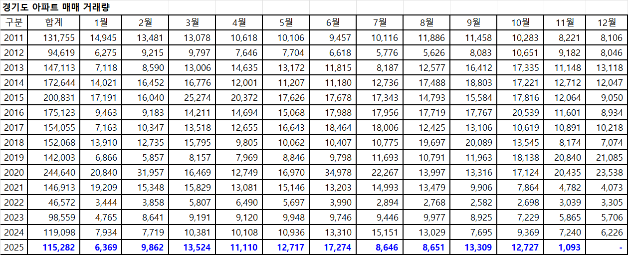 11월 경기도아파트 매매 거래량은 현재 1,093건입니다. 아직은 데이터로써 신뢰도가 낮은 구간 이기는 하지만, 이 데이터로 11월 경기도아파트 최종 매매 거래량을 예측해 보면, 약 20,793건이 됩니다.