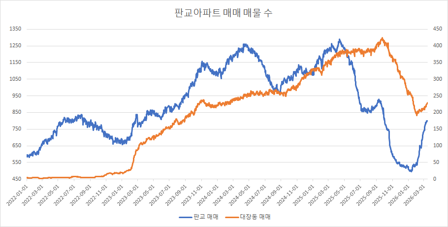 대장동아파트 매매 매물 수는 5주 연속 증가하고 있습니다.
