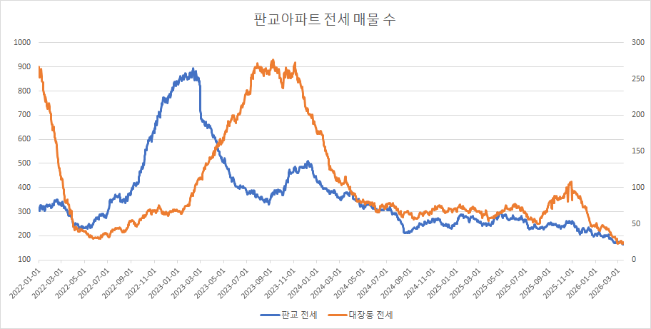 대장동아파트 전세 매물 수는 감소하고 있습니다.