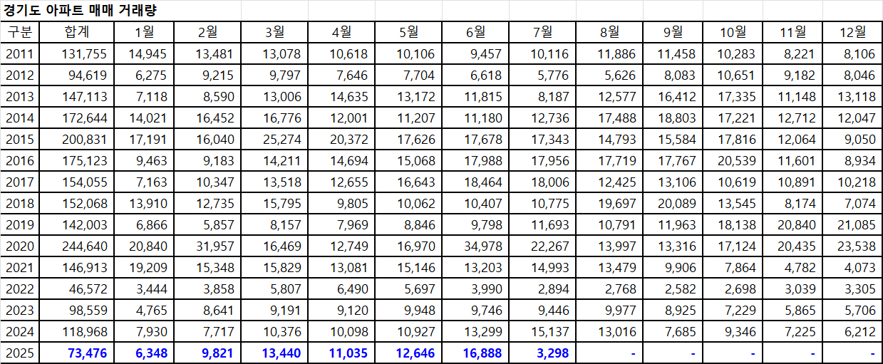 아래 표는 경기도아파트 매매 거래량입니다.