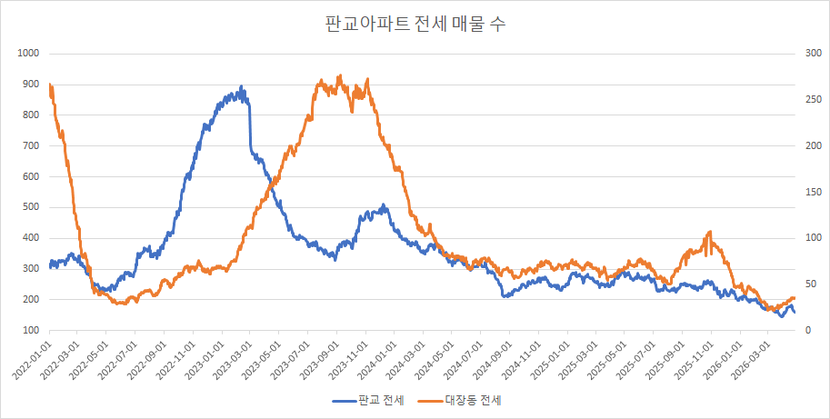 대장동아파트 전세 매물 수 또한 최근 3주 연속 감소 중이었으나, 이번 주에는 보합입니다.
