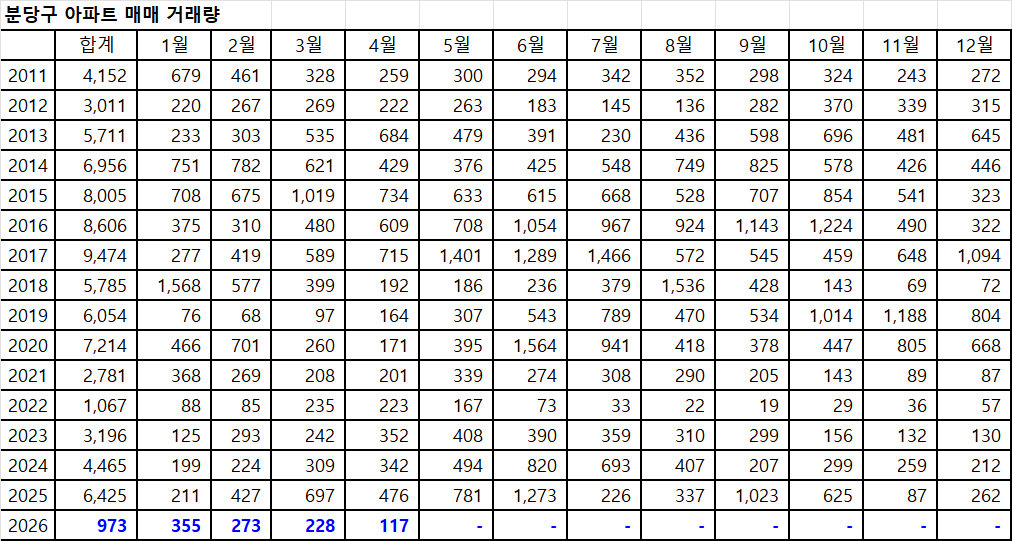 4월 분당구아파트 매매 거래량은 현재 117건입니다. 이 데이터로 4월 분당구아파트 최종 매매 거래량을 예측해 보면, 약 351건이 됩니다.