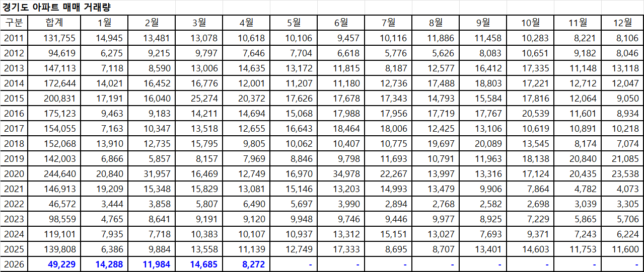 아래 표는 경기도아파트 매매 거래량입니다.