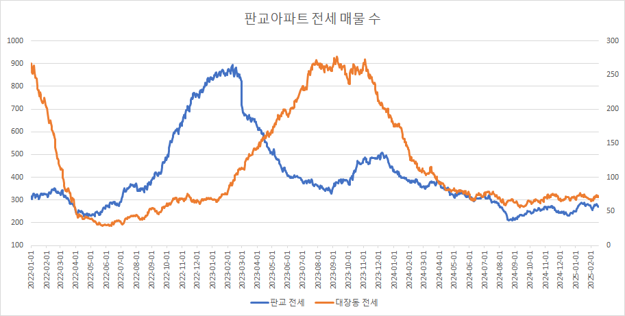 대장동아파트 전세 매물 수는 지난주 감소에 이어서 이번 주에는 보합을 보이고 있습니다