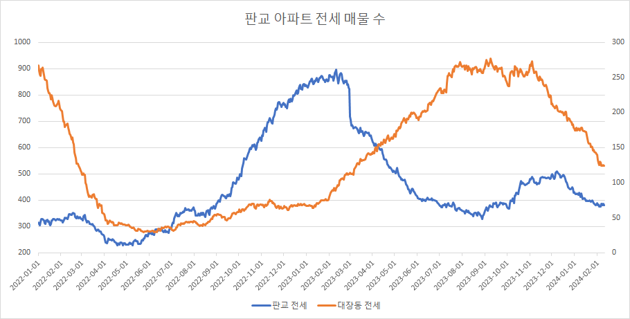대장동 아파트 전세 매물 수는 14주 연속 감소하고 있습니다.