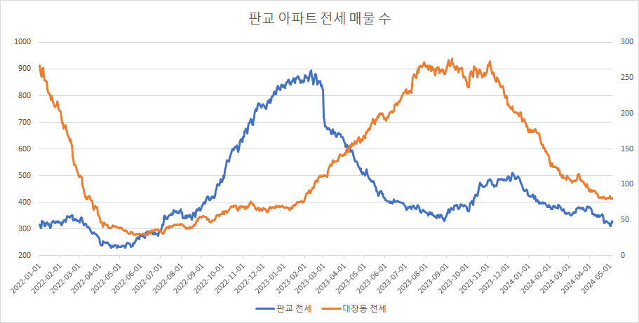 대장동아파트 전세 매물 수는 감소 추세를 이어가고 있었으나 이번주에는 지난주 대비 보합을 보이고 있습니다.