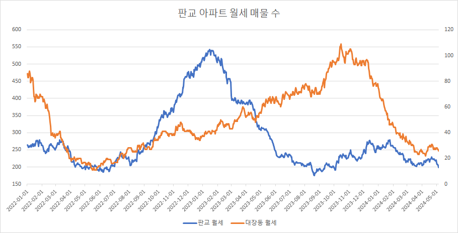 대장동아파트 월세 매물 수는 감소 추세를 길게 이어왔으나, 최근 들어서 바닥권을 형성하려는 듯 증가와 감소를 반복하고 있는데, 이번주에는 지난주 대비 보합을 보이고 있습니다.