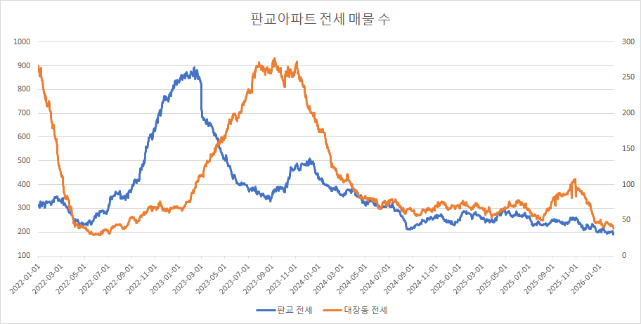 대장동아파트 전세 매물 수는 3주 연속 감소하고 있습니다.