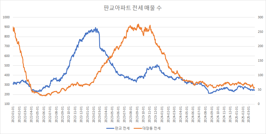 대장동아파트 전세 매물 수는 최근 2주 연속 증가 중이었으나, 이번 주에는 감소로 돌아 섰습니다.