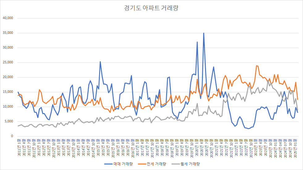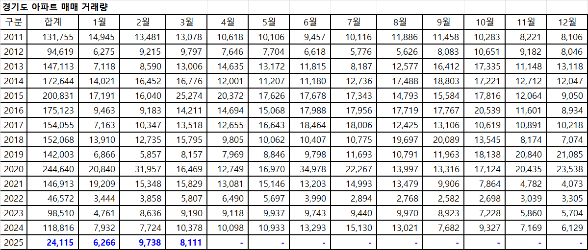 아래 표는 경기도아파트 매매 거래량입니다.
