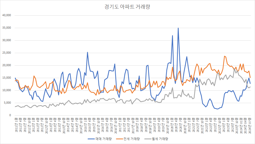 결국은 7월 경기도아파트 매매 거래량 피크를 넘지 못하고 꺾이는 모습을 보여주고 있습니다.