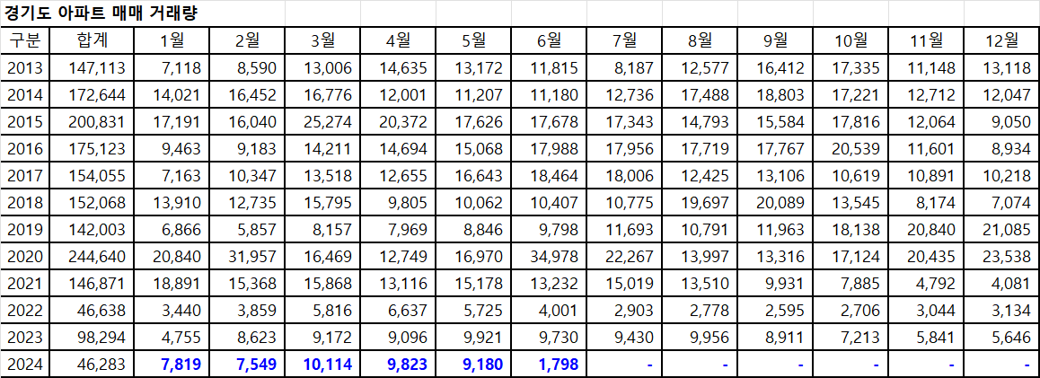 아래 표는 경기도 아파트 매매 거래량입니다.