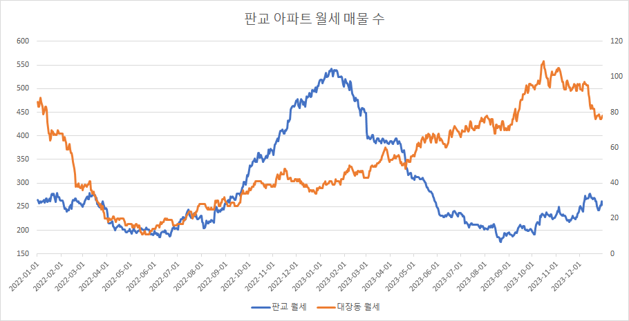 대장동 아파트 월세 매물 수는 그간 급감했으나 이번주에는 보합 상태입니다.