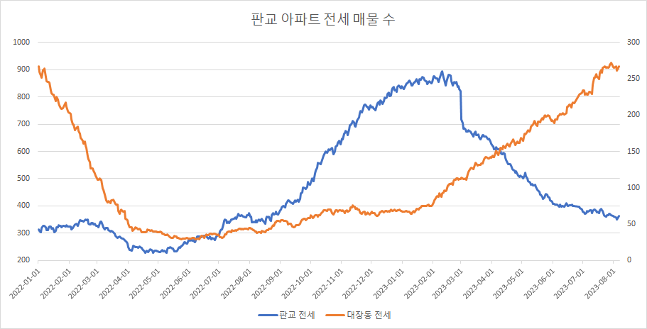 다만 대장동 아파트 전세 매물 수가 휴가기간 동안 감소를 했는데, 이것이 휴가의 영향인지는 며칠 지켜봐야 할 듯합니다.