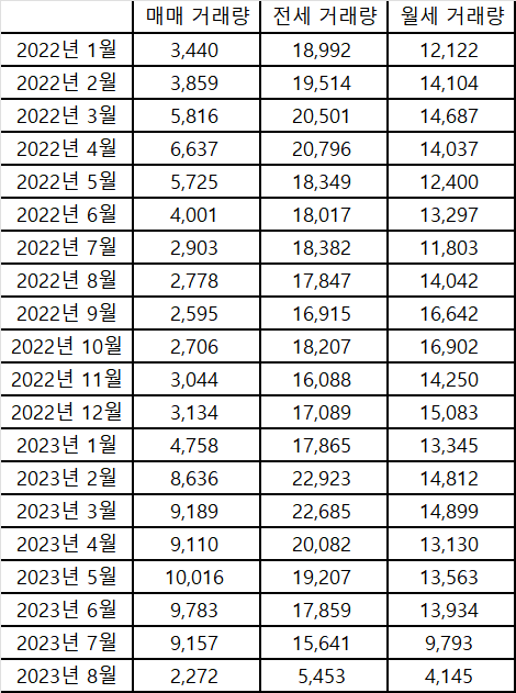 부동산 시장은 한정된 수요 안에서 매매나 전세 또는 월세 중에 하나를 선택할 수밖에 없기 때문에 어느 한쪽의 거래량이 증가하면 다른 쪽은 감소를 할 수밖에 없습니다.
