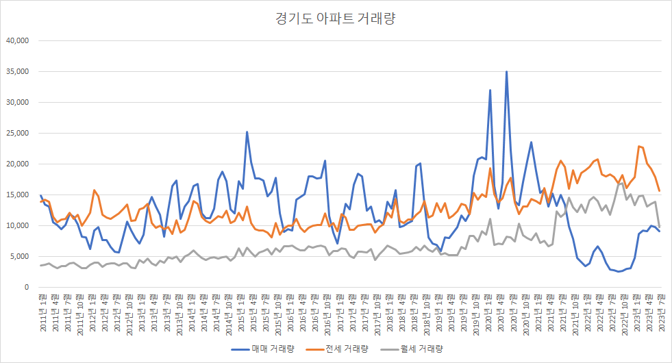 아래는 경기도 아파트 매매 및 전/월세 거래량을 2011년부터 그래프로 그렸습니다.