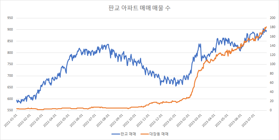 대장동 아파트 매매 매물 수는 추세적으로 증가를 하고 있고, 한동안 이러한 추세가 이어질 것으로 생각됩니다.