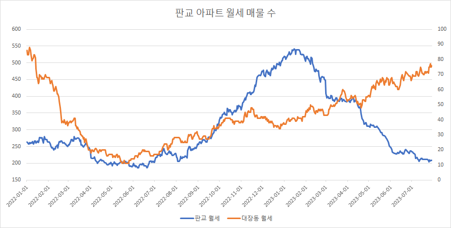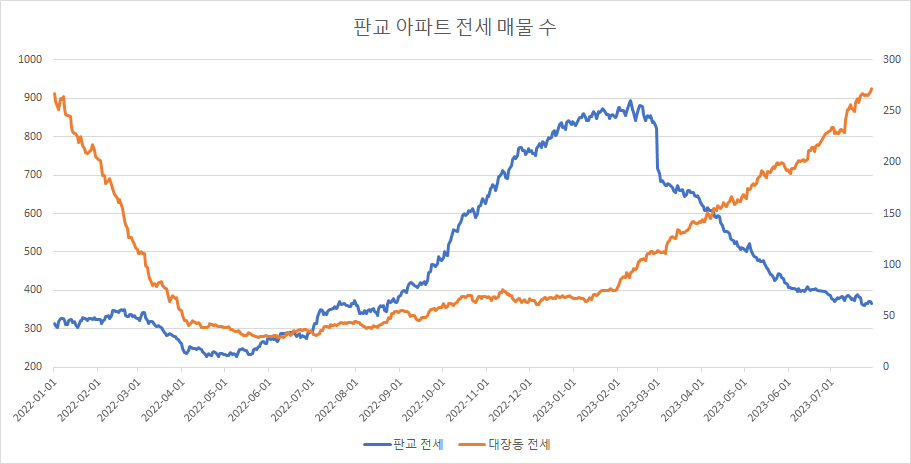 대장동 아파트 전세 매물 수는 계속 증가를 하고 있습니다.