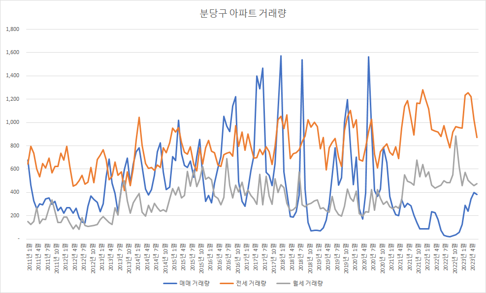분당구 아파트 거래량 및 매물 수 변화 20230730
