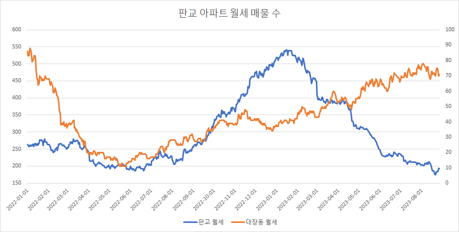 대장동 아파트 월세 매물 수 또한 추세 상승을 끝내고 횡보로 들어간 모습입니다.
